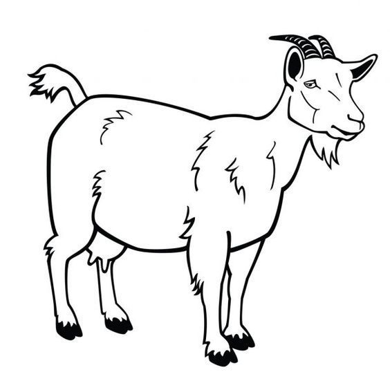 A goat is standing and gazing at a black-and-white outline shape on a white background, ready to be colored.