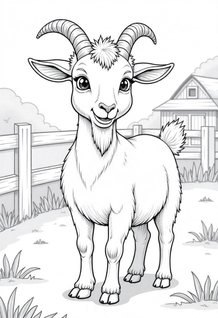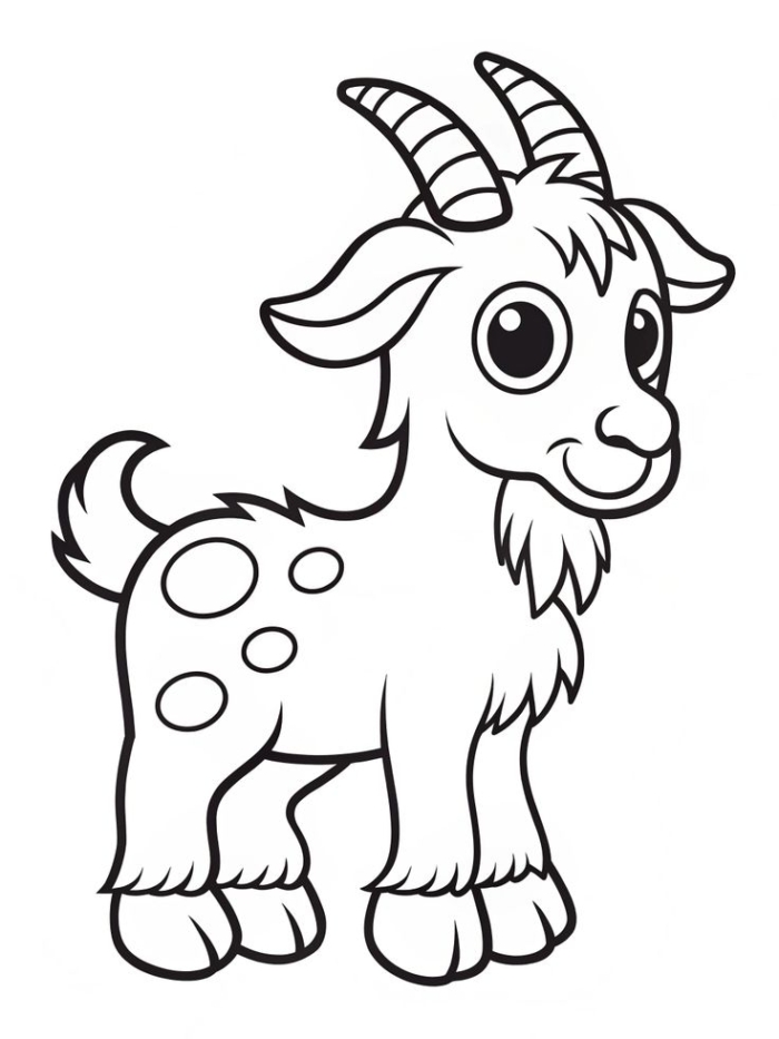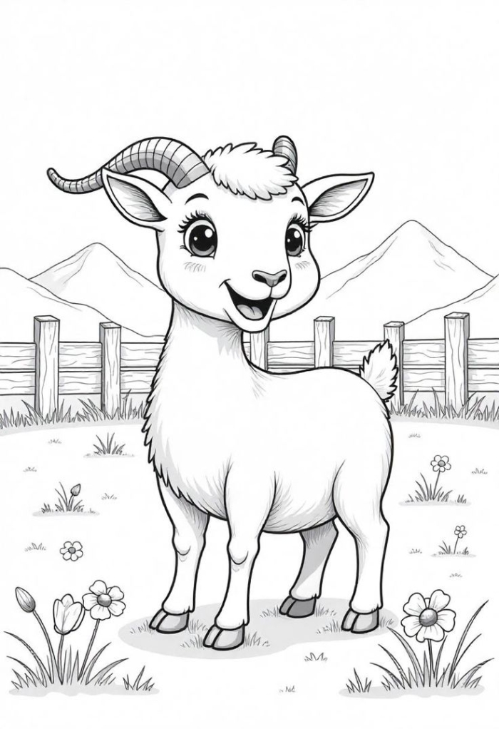 A delightful coloring page featuring a cute goat standing happily with intricate details to fill in with color.