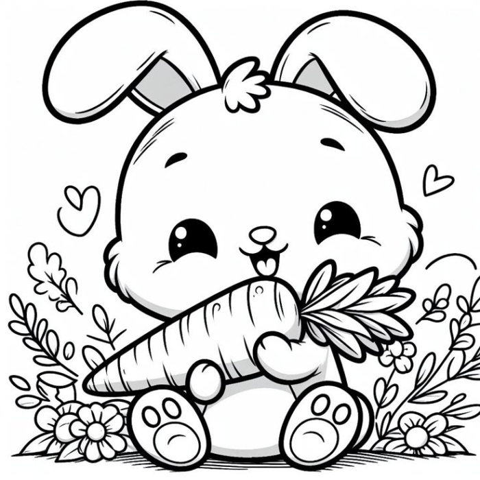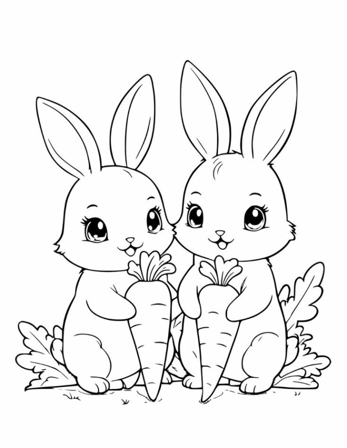 A cute kawaii-style lineart coloring page featuring Easter bunnies eating carrots, perfect for kids to enjoy and color.