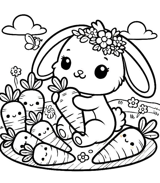 A cute cartoon bunny sitting in the grass, with a few carrots and flowers on her head, ready to be colored.