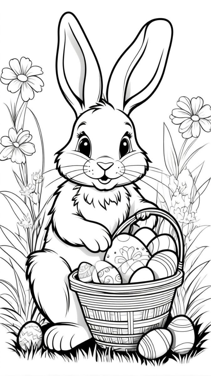 A cute rabbit sitting inside a basket filled with colorful fruits and vegetables, with leafy plants on the side, perfect for coloring.