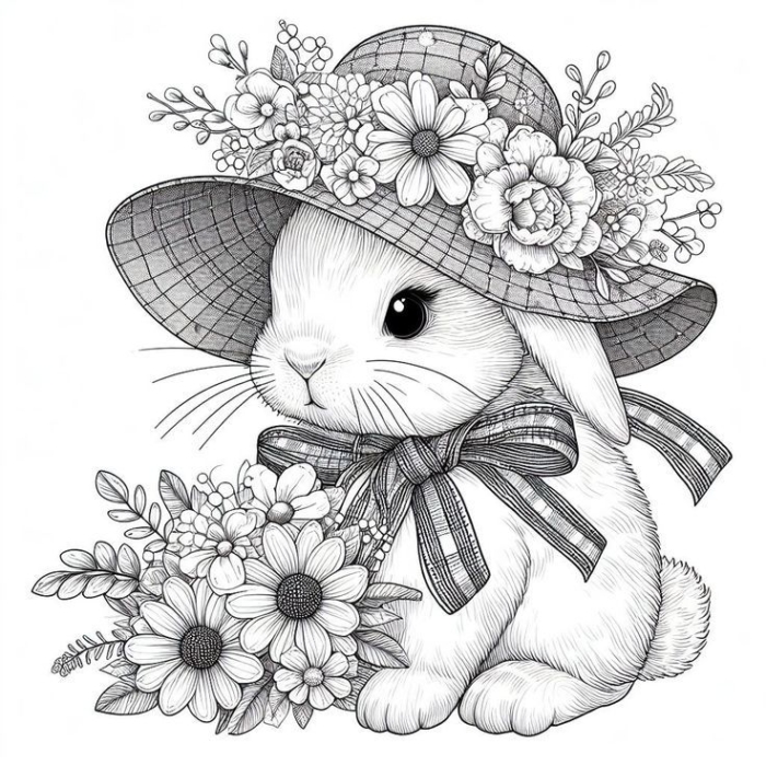 A coloring page drawing of a rabbit wearing a hat decorated with flowers, sitting next to a bunch of daisies.