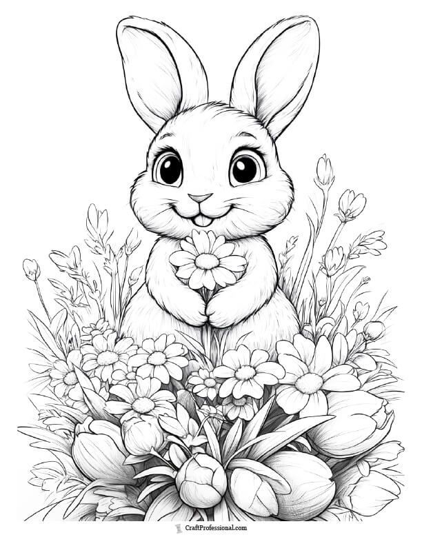 A black and white outline of a bunny sitting on the ground with flowers in the background, designed as a coloring page.
