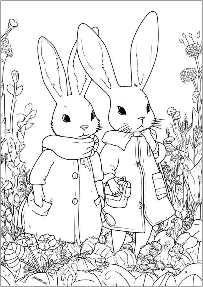 A coloring page featuring two cute rabbits sitting among blooming flowers and lush plants in the woods.