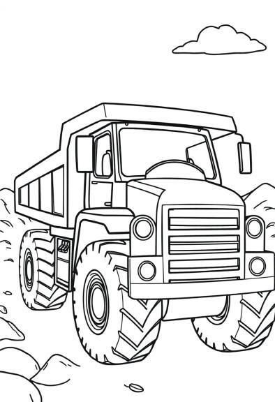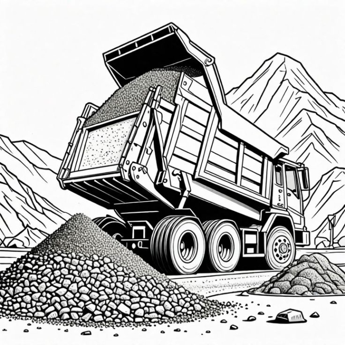 A dump truck loaded with gravel driving along a mountain path surrounded by rocks, perfect for coloring.