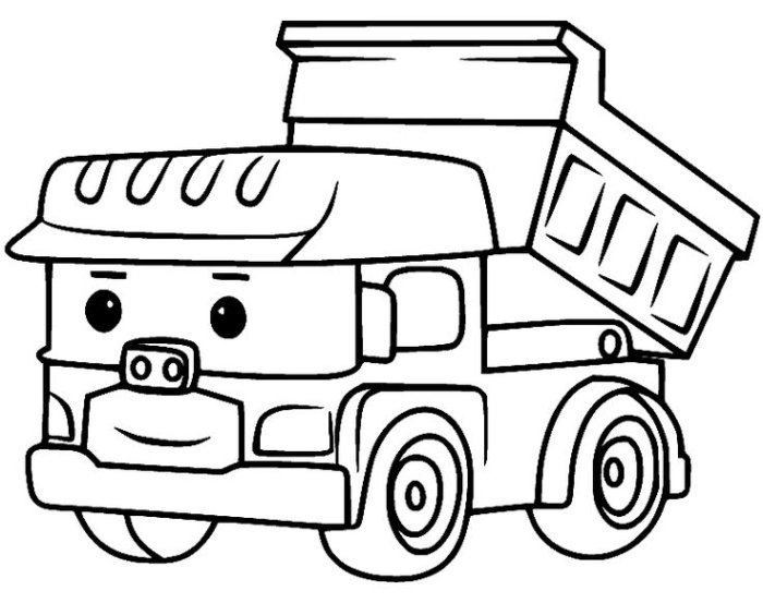 A black and white cartoon-style coloring page featuring a dump truck with expressive eyes on its face.