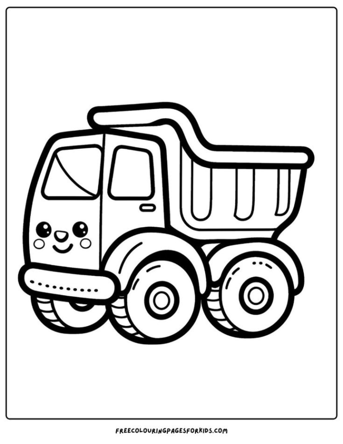 A black and white outline drawing of a dump truck with a cheerful smile on its face, perfect for coloring.