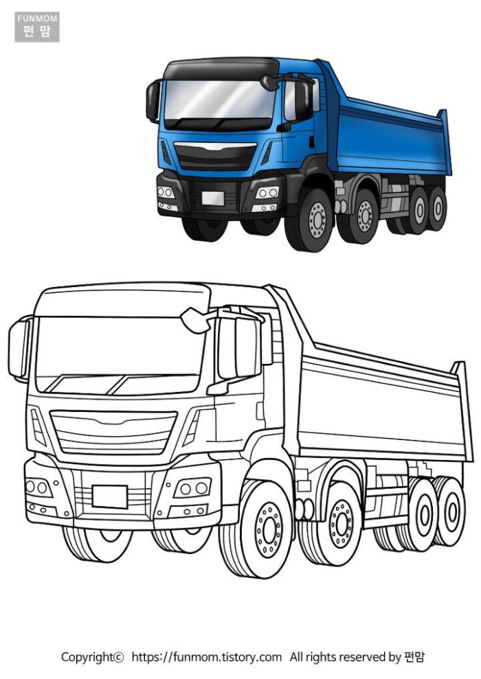 A blue dump truck is positioned beside a black and white drawing of another dump truck for coloring.