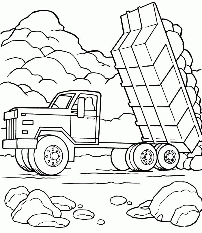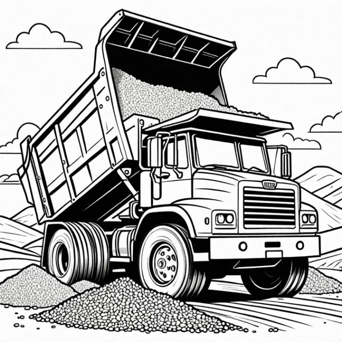 A black and white line drawing of a dump truck on the road with gravel in the background, perfect for coloring.