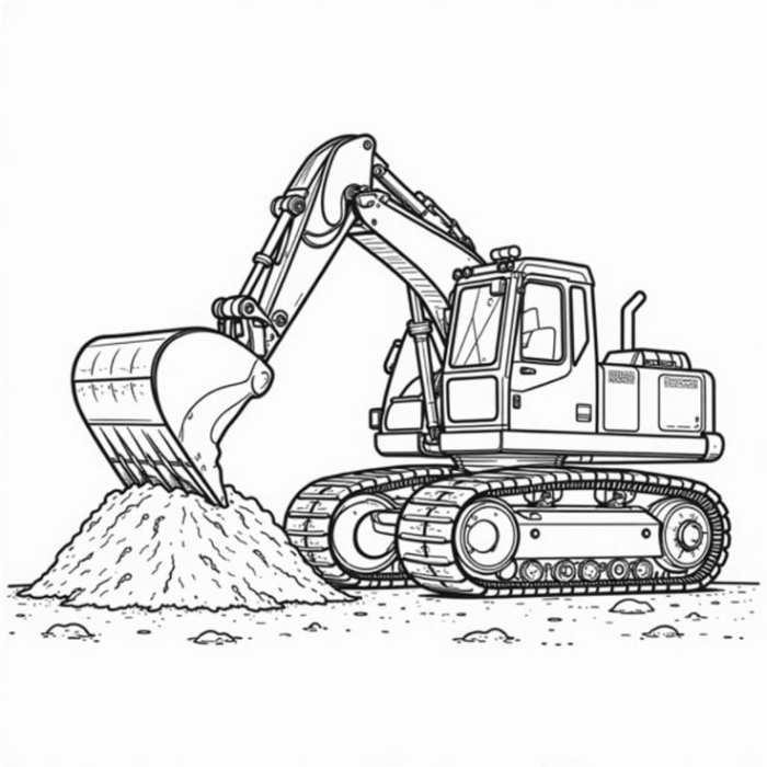 A coloring page depicting an excavator dumping dirt into a dump truck, perfect for kids who enjoy coloring and love construction vehicles.