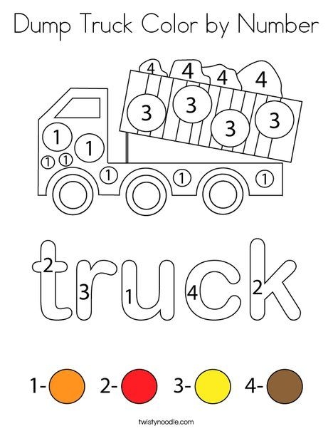 A dump truck puzzle is featured in the coloring page, with the truck’s name displayed in red, yellow, and green.