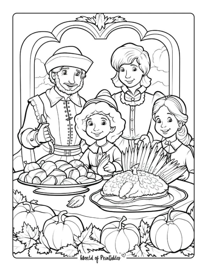 A Thanksgiving coloring page featuring children and adults gathered around a table with a turkey in front of them.